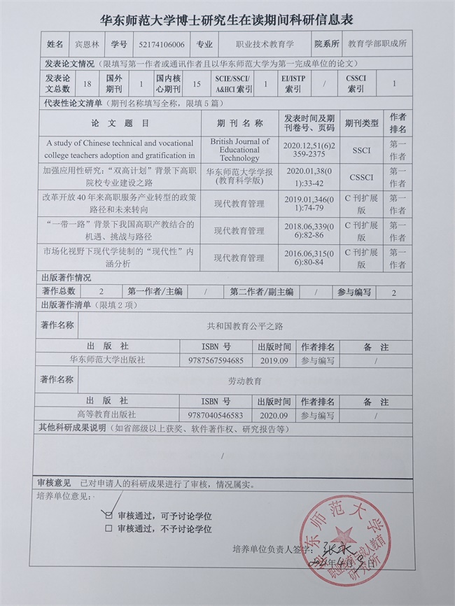 根据华东师范大学研究生院关于博士研究生科研成果发表要求的相关规定,职业教育与成人教育研究所对2021年秋季拟毕业博士生的科研情况进行了审核,现将复核结果予以公示。公示期自2021年4月12日至4月18日(五个工作日),在此期间如有异议,请与职成教所办公室联系。